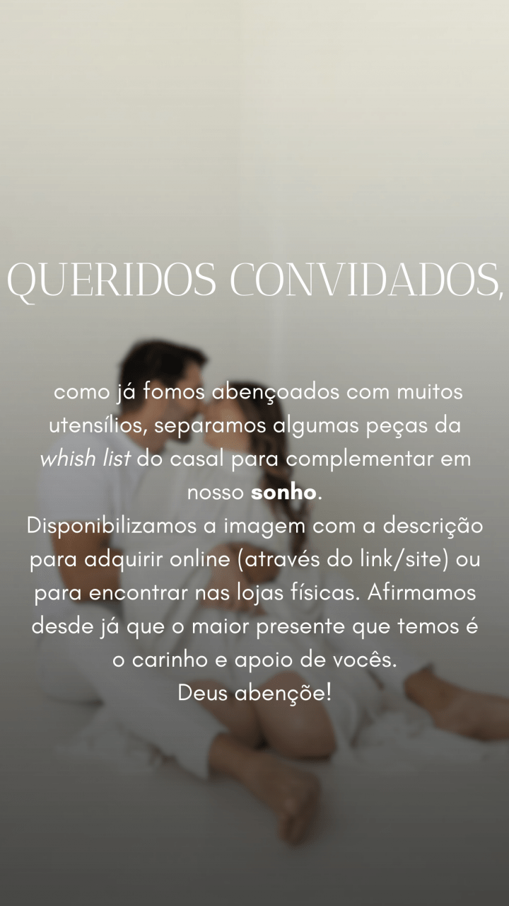 Gostaríamos muito de contar com a presença de todos vocês no momento em que nossa união será abençoada diante de Deus! Contamos com vocês! Dia 19 de DEZEMBRO de 2025, sexta-feira, às 18H30.